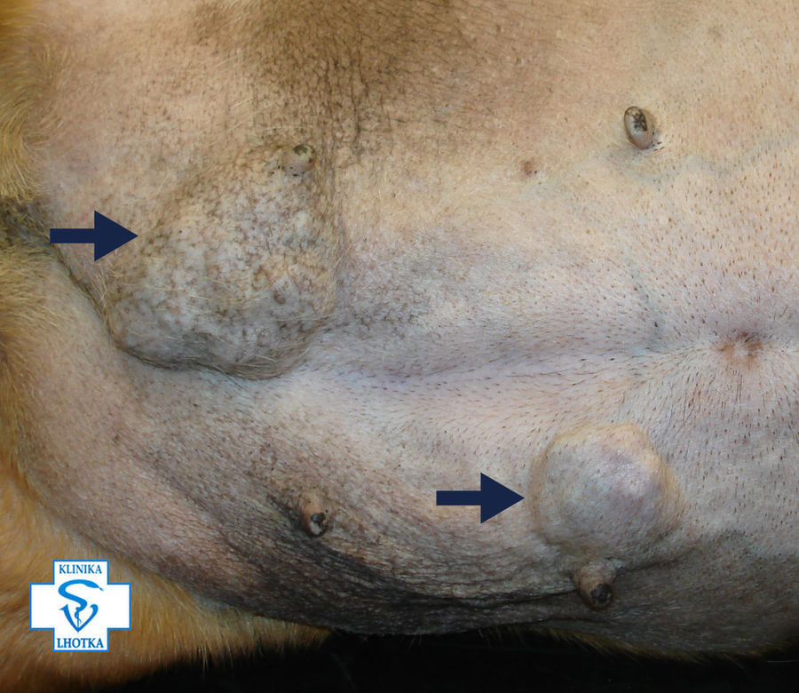Na fotografii jsou patrné 2 velké nádory na mléčné žláze.