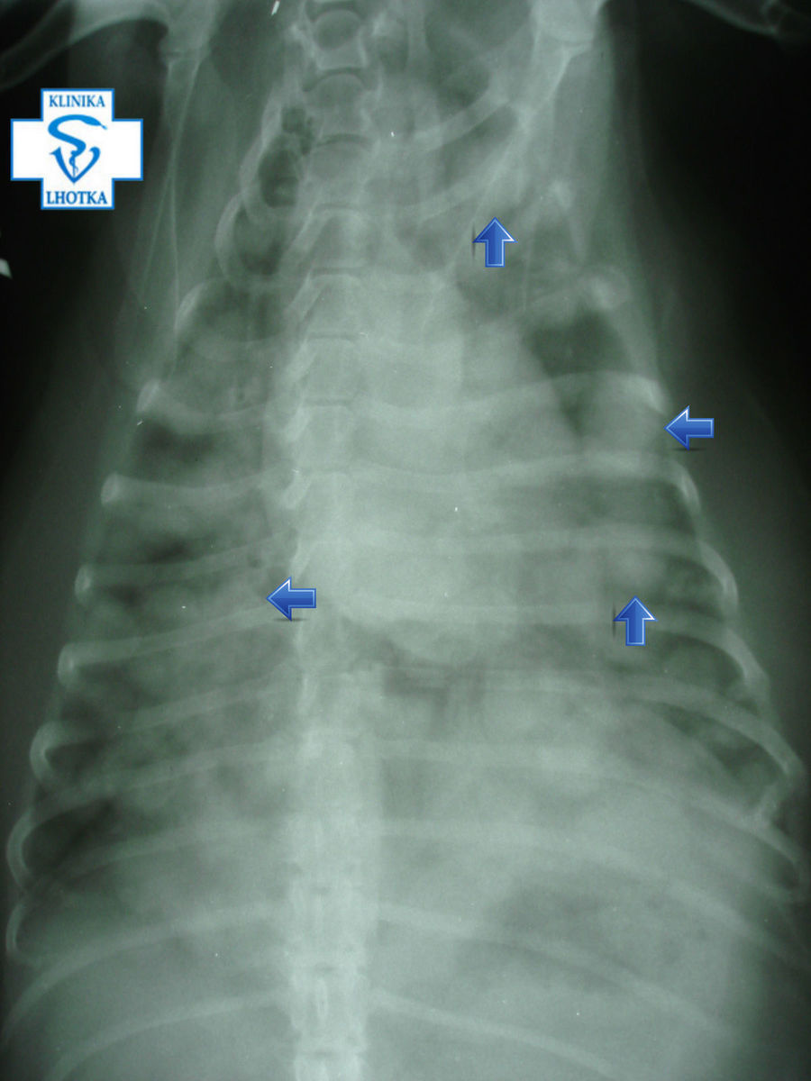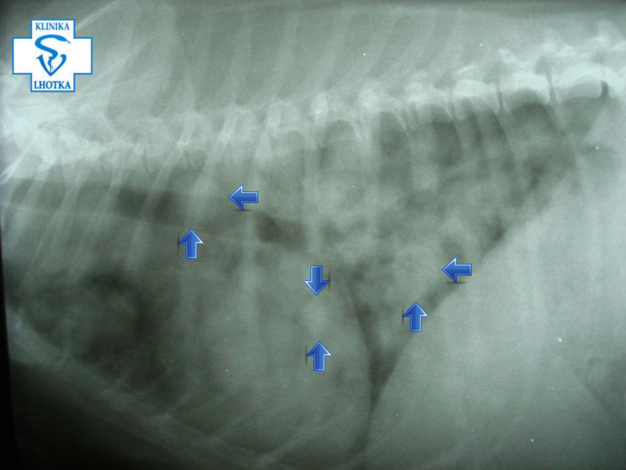 Nádory na mléčné žláze se od minulého vyšetření nezvětšily a stále byly klidné a nebolestivé, ale fenečka vykazovala mírnou dušnost. Přikročili jsme tedy k rentgenologickému a sonografickému vyšetření, abychom zjistili, co se v těle fenky odehrává.
