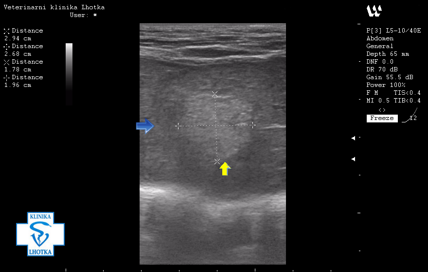 Na tomto obrázku modrá šipka odděluje normální strukturu jater od metastáze. Střed útvaru má jinou strukturu, než nepostižená jaterní tkáň (žlutá šipka).