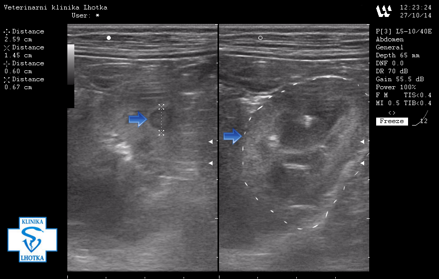 Na pravé straně je šipkou a šrafováním vyznačen obrys levé ledviny. Na levé straně modrá šipka ukazuje na kulovitý útvar, pravděpodobně metastázu v kůře ledviny.