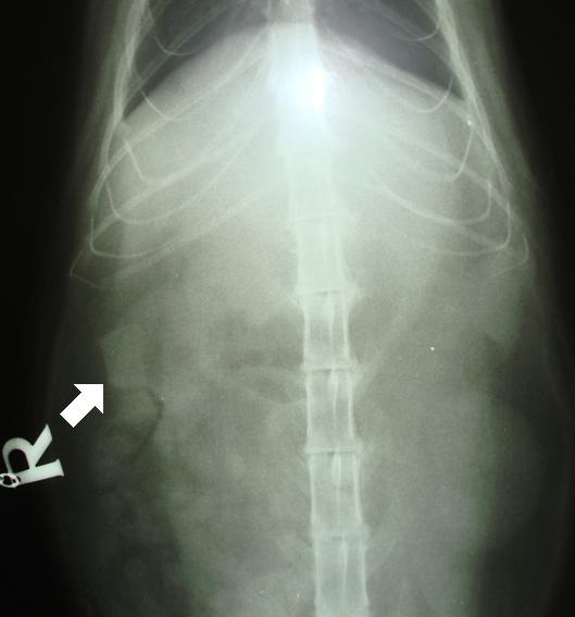 Klinickým vyšetřením jsme zjistili dehydrataci, sníženou tělesnou teplotu a výraznou bolestivost břicha. Vzhledem k anamnéze a klinickým nálezům jsme přistoupili k rentgenologickému a ultrasonografickému vyšetření dutiny břišní. Obě tato vyšetření nám potvrdila nález cizího tělesa v tenkém střevě, které bránilo normálnímu průchodu zažitiny trávícím traktem, což je zásadní život ohrožující stav.