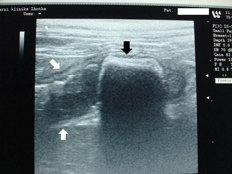 Na obrázku z ultrasonografu ukazuje černá šipka na cizí těleso v tenkém střevě, ze kterého je vidět jen jeho přivrácený obrys. Zbytek tělesa nám ultrasonografické vlny nepropouští, a proto se za ním vytváří černý sonografický stín. Bílé šipky ukazují na rozšířené střevo před cizím tělesem, ve kterém stagnuje střevní obsah, kdežto za ním je střevo prázdné.