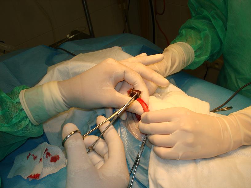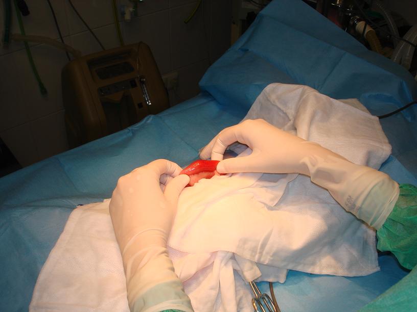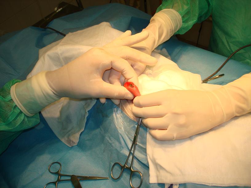 Po otevření dutiny břišní se provedla revize celého trávícího traktu a nalezla se část střeva, ve které bylo cizí těleso zachycené. Tato střevní klička se důkladně zarouškovala, čímž se oddělila od zbytku dutiny břišní.