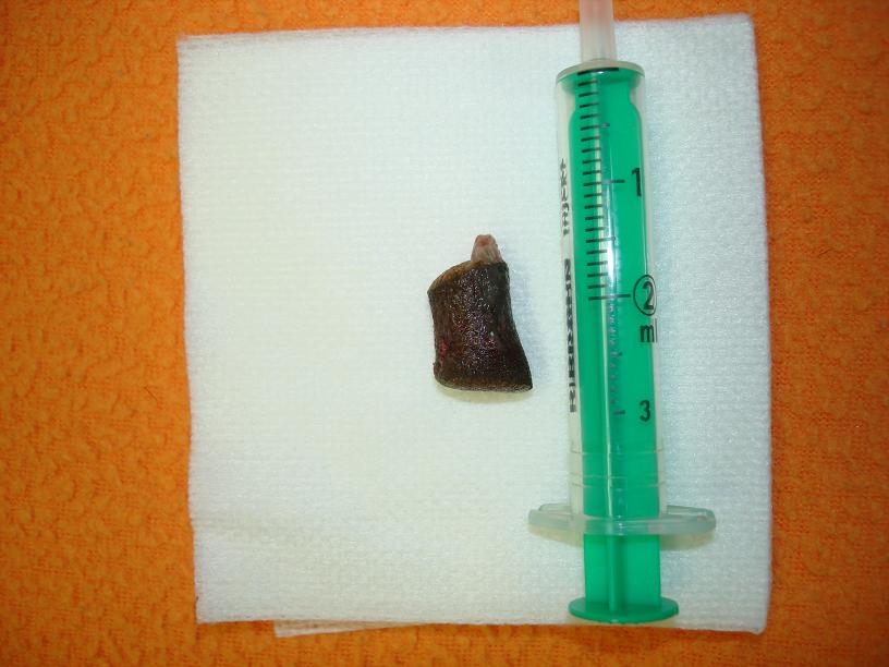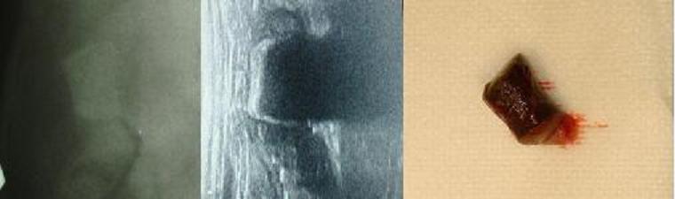 Na následujících snímcích je vyobrazeno cizí těleso jak bylo vidět na RTG snímku, na ultrasonografu a jak vypadalo reálně.