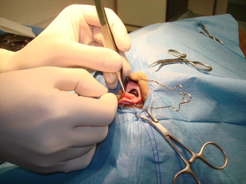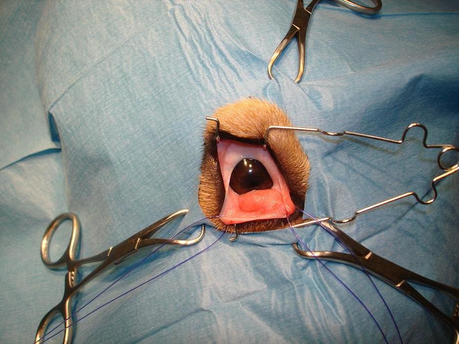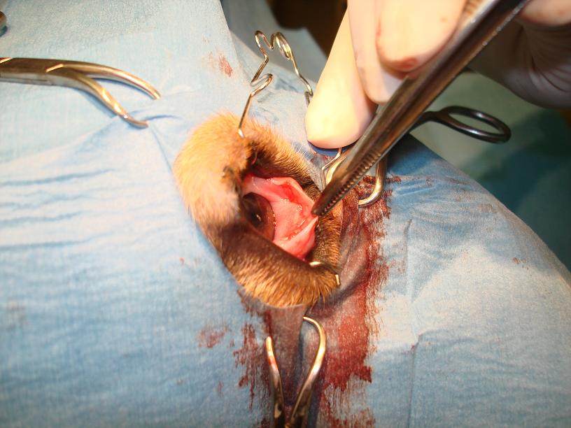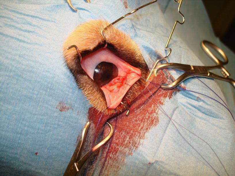 Po přípravě pacienta k operaci se třetí víčko zafixuje situačními stehy a odhalí se tak celá žláza:
