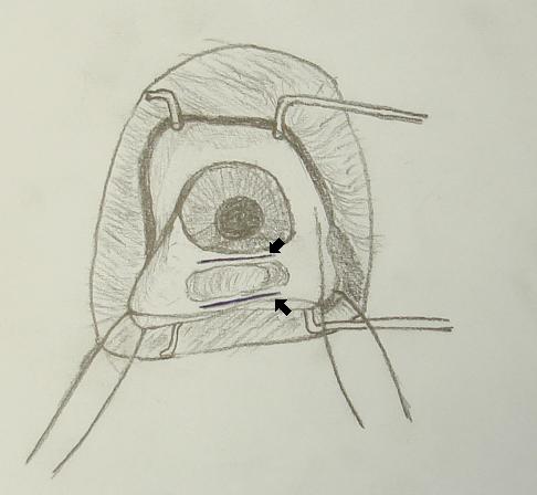 Následně se provedou dva paralelní řezy do spojivky třetího víčka před a za žlázou: